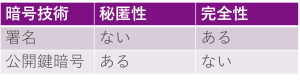公開鍵を使うという共通点で、公開鍵暗号との比較の表を記載しました。