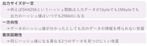 3点目は、衝突困難性ですが、同じハッシュ値になる異なる2つのデータを見つけにくいといった性質になります。データを見つけにくいと書いたのは、実は、同じハッシュ値になる異なるデータは存在していて、SHA-1というハッシュ関数は、この衝突困難性が破られたので、現在では使用されていません。