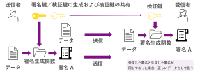 事前に署名生成関数を決めておき、送信者側で署名鍵と検証鍵生成して、受信者に検証鍵を渡します。ここで言う、署名鍵は秘密鍵と同様で他者には知られてはいけない鍵になり、検証鍵は公開鍵と同様で他者に知られてもよい鍵となります。