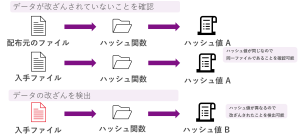 異なるデータから同じハッシュ値は生成されないため、ハッシュ値を用いることでデータが改ざんされていないことを確認でき検出もできます。