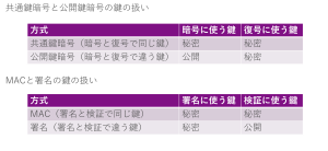 共通鍵暗号と公開鍵暗号の鍵の扱いと、MACと署名の鍵の扱いについてとなります。