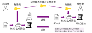 次に、送信者はデータと秘密鍵からMAC生成関数を使ってMAC値を作り、データと一緒にMAC値を受信者に送ります。