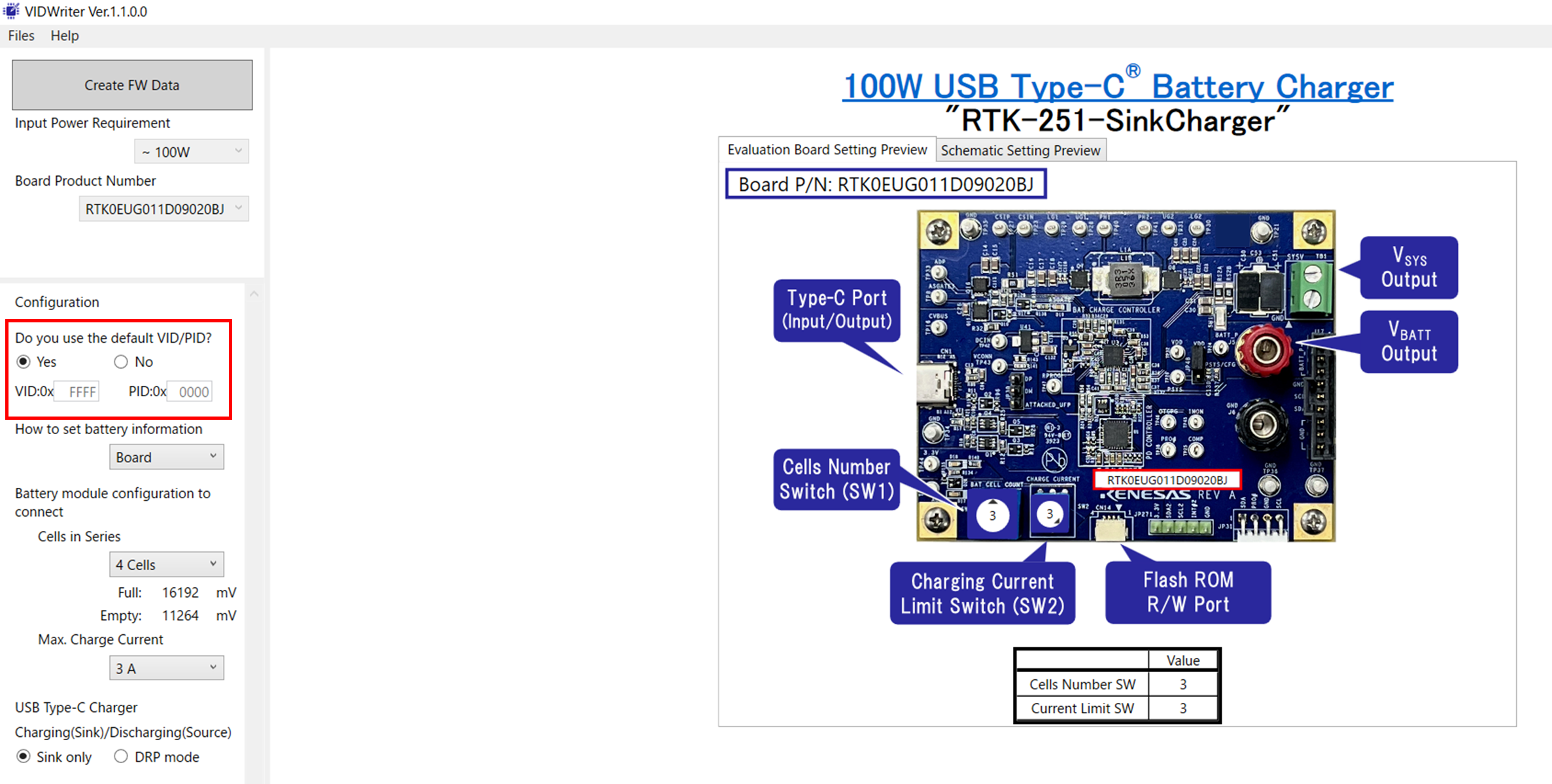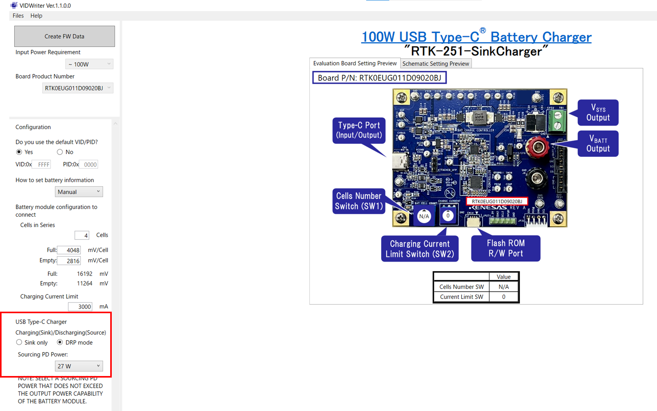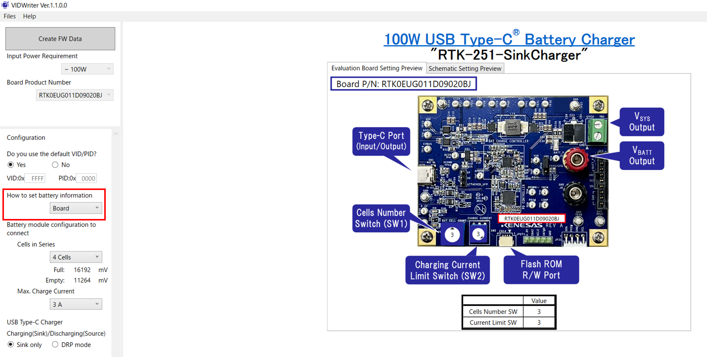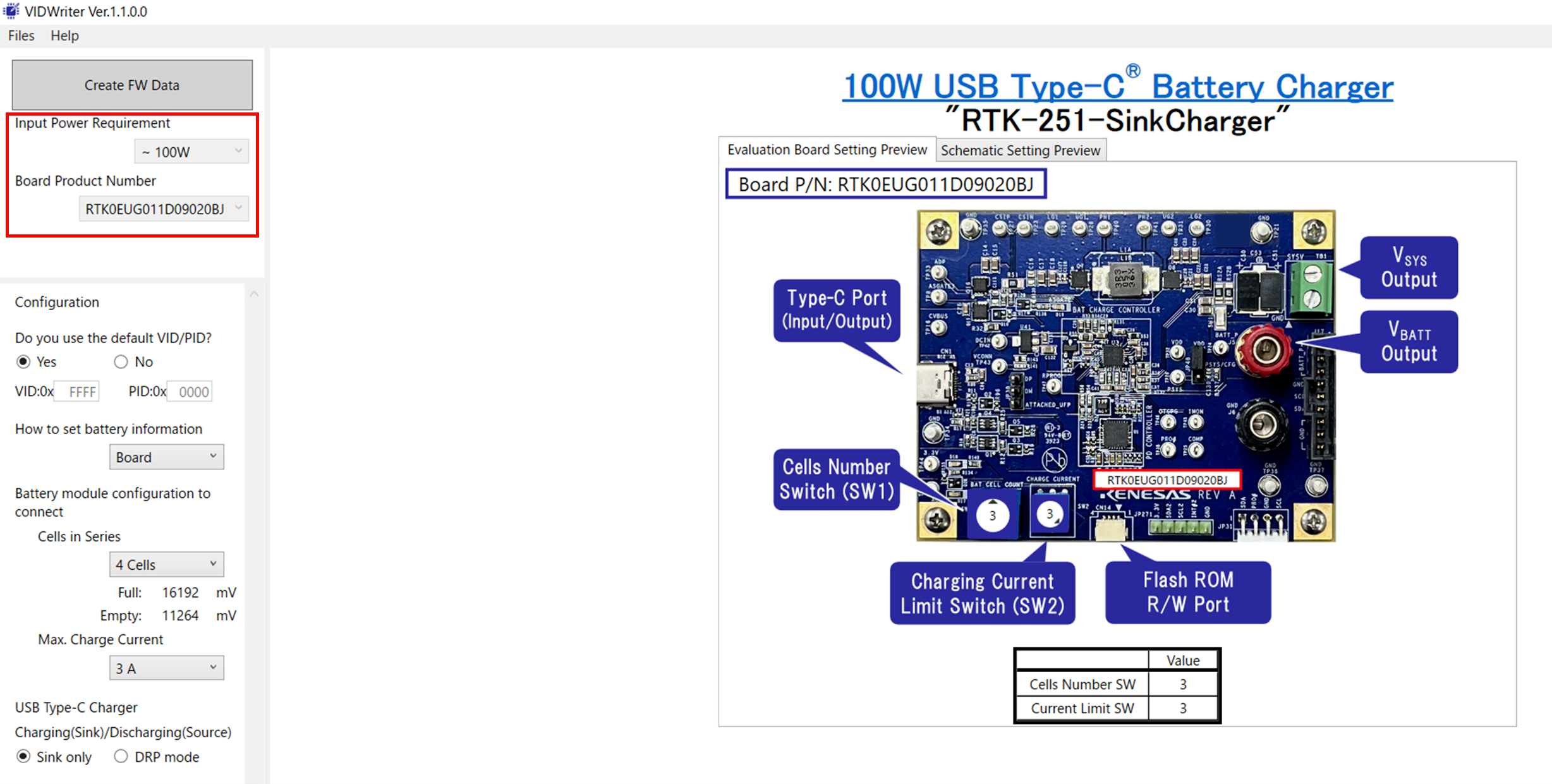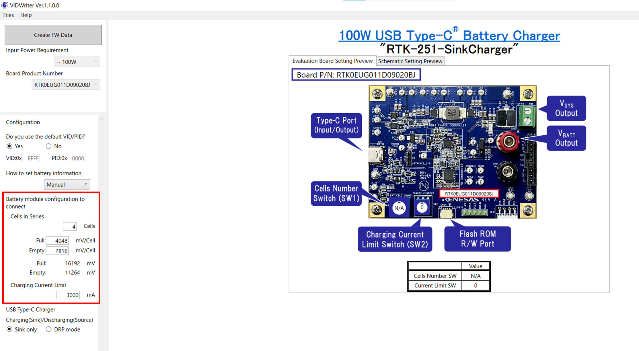 Renesas社が用意している”RTK0EUG011D09020BJ”を使用します。本評価ボードは2~7セルのバッテリ・システムを実装するためのシングル・ポート・リファレンス・デザインとなっており、USB Power Deliveryと組み合わせたバッテリ充電ソリューションの評価に最適です。今回は評価ボードに搭載されているUSB PD コントローラのFirmwareを書き換え、USB Type-CのBUS電圧や充電電圧を変更してみます。