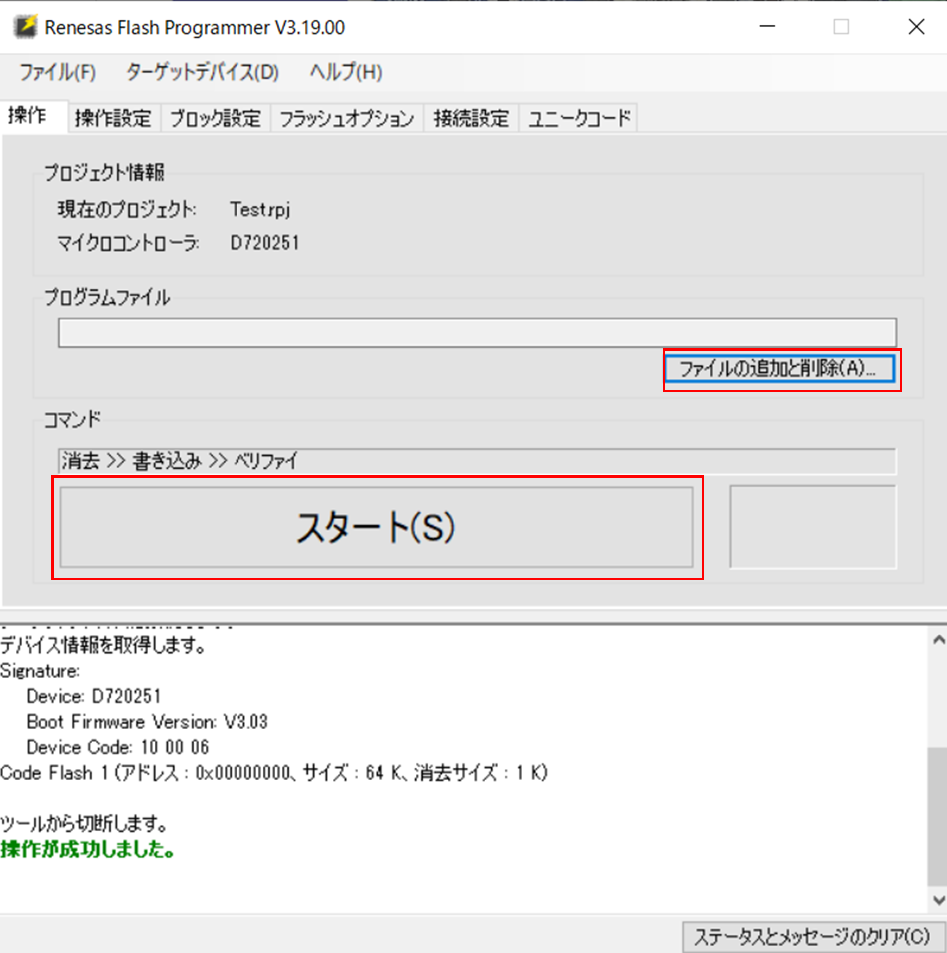 4. 次に先ほど生成したFirmwareの書き込みを行います。「ファイルの追加と削除(A)」から先ほど生成したファイルを追加し「スタート(S)」をクリックします。