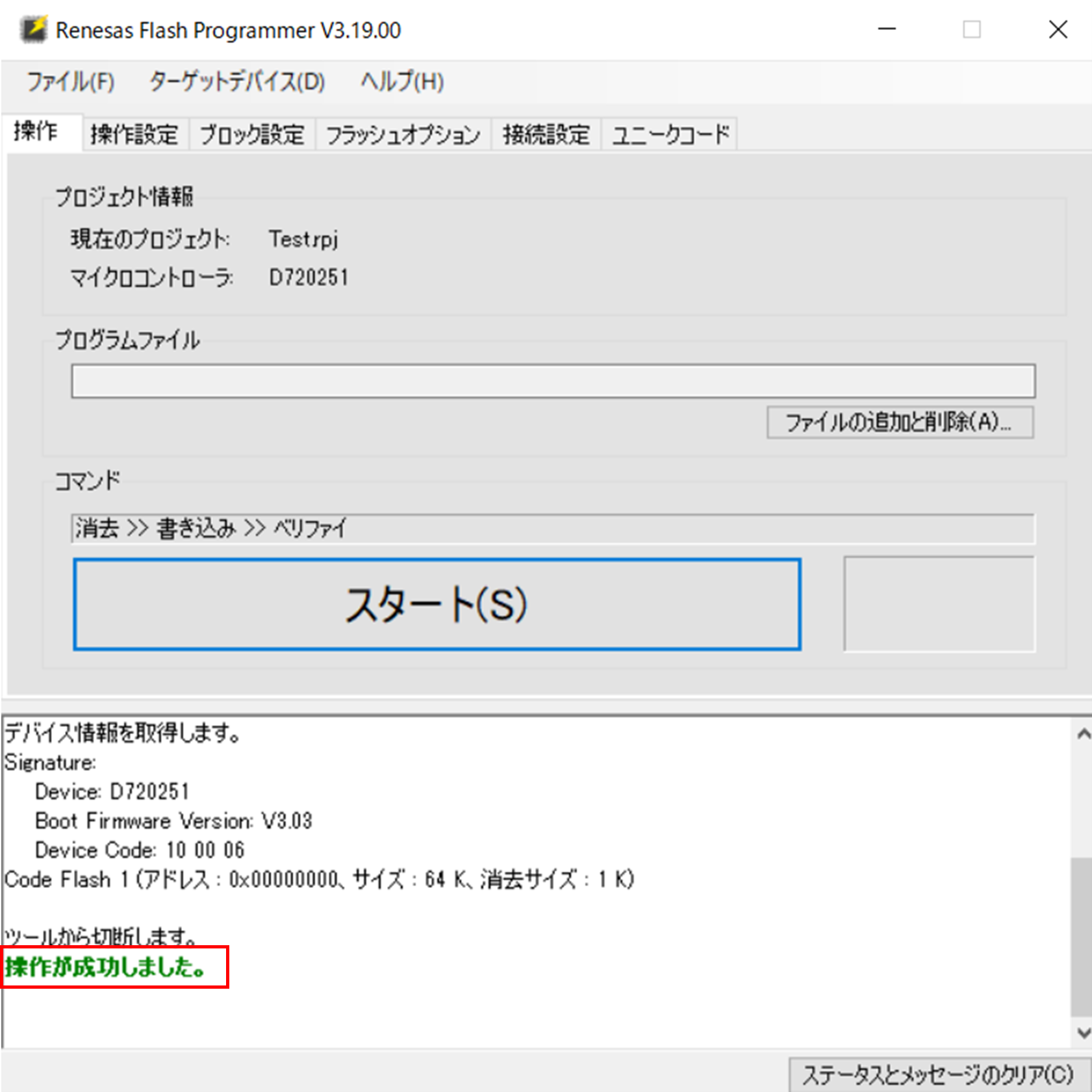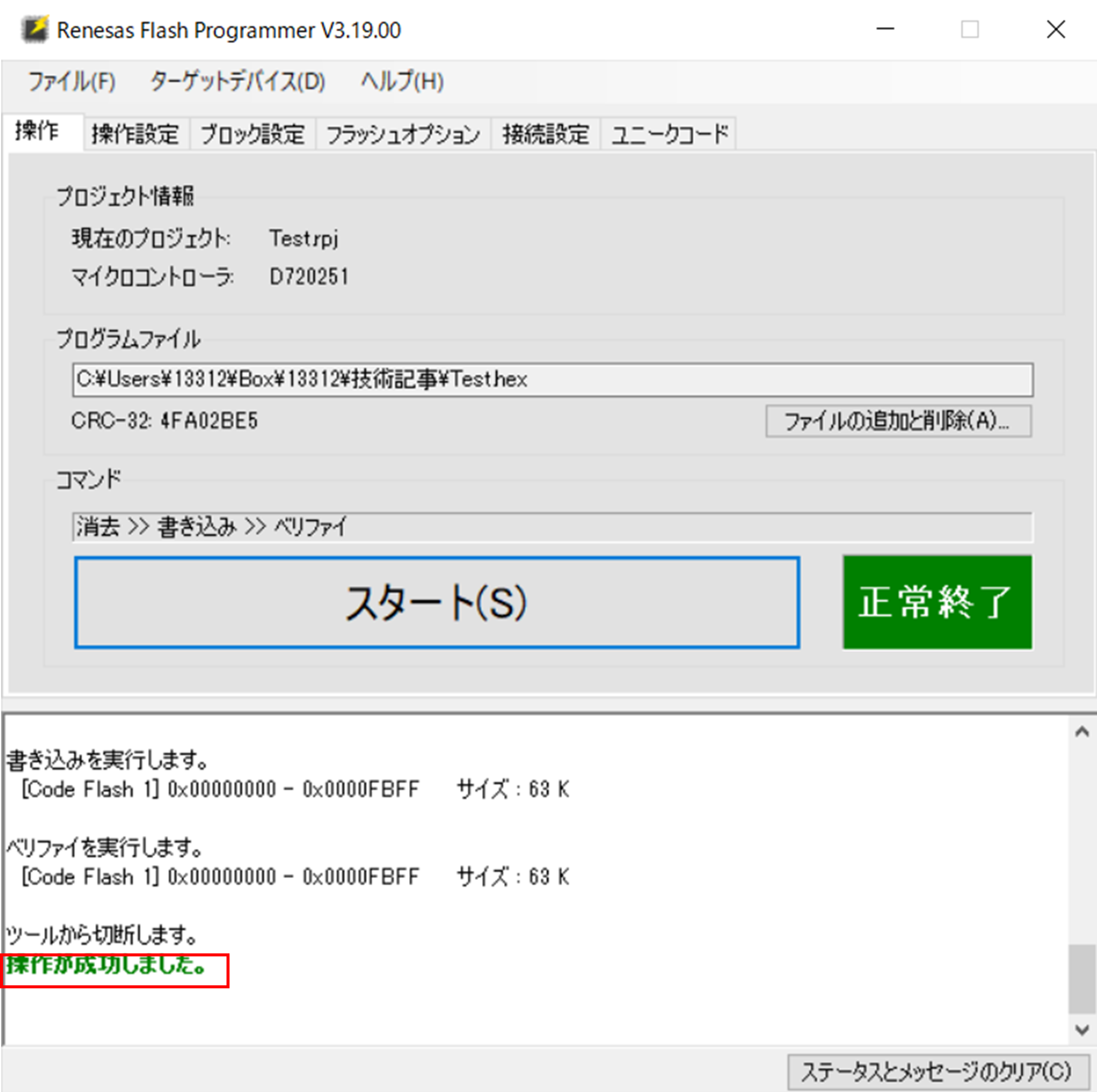 5. ステータスメッセージ欄を確認し、「操作が成功しました」となっていればFirmwareの書き換えは完了です。