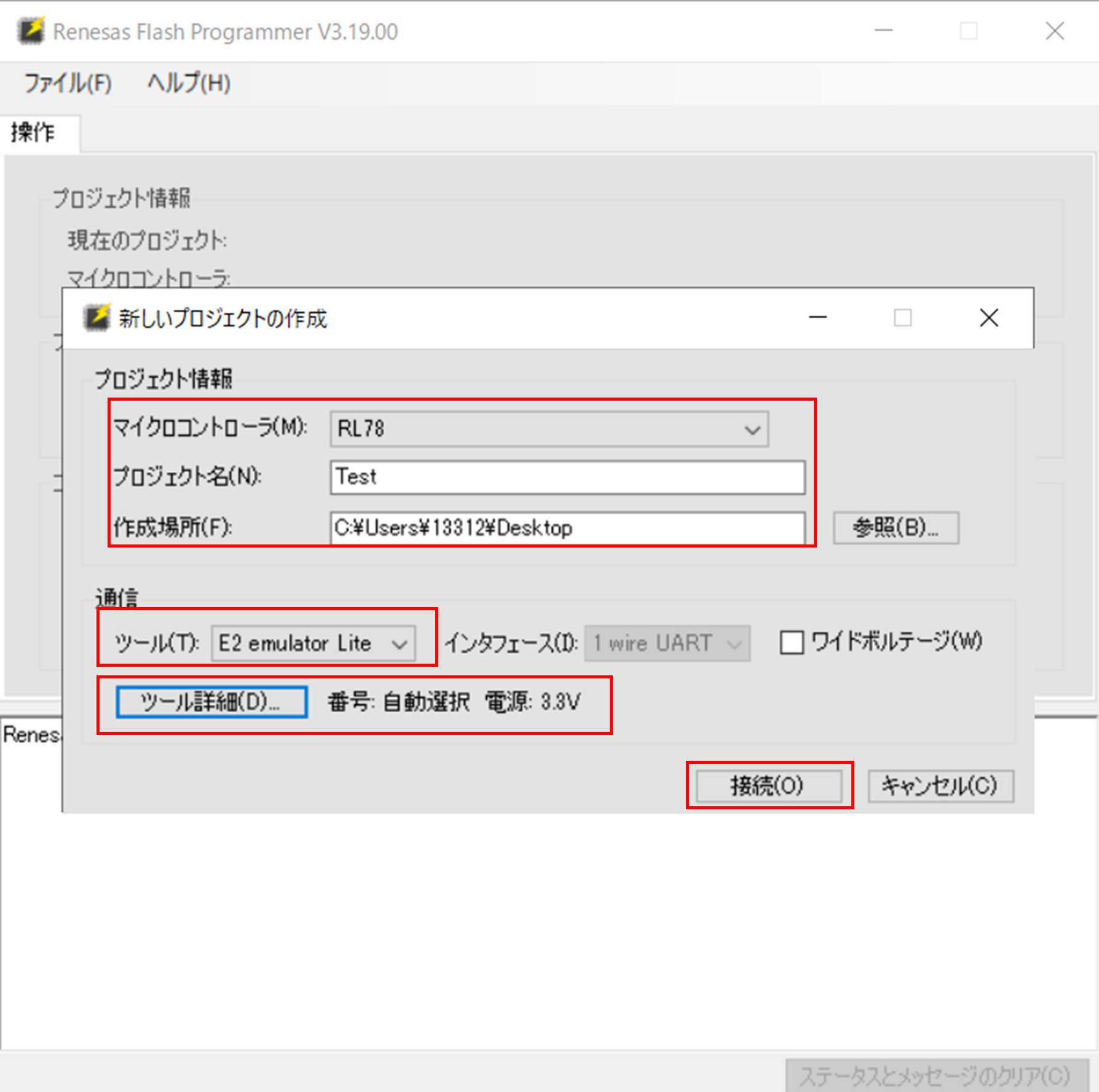 2. Renesas Flash Programmerを開き、画面左上の「ファイル」から「新しいプロジェクトの作成」をクリックし、以下のようにプロジェクト情報を入力します。