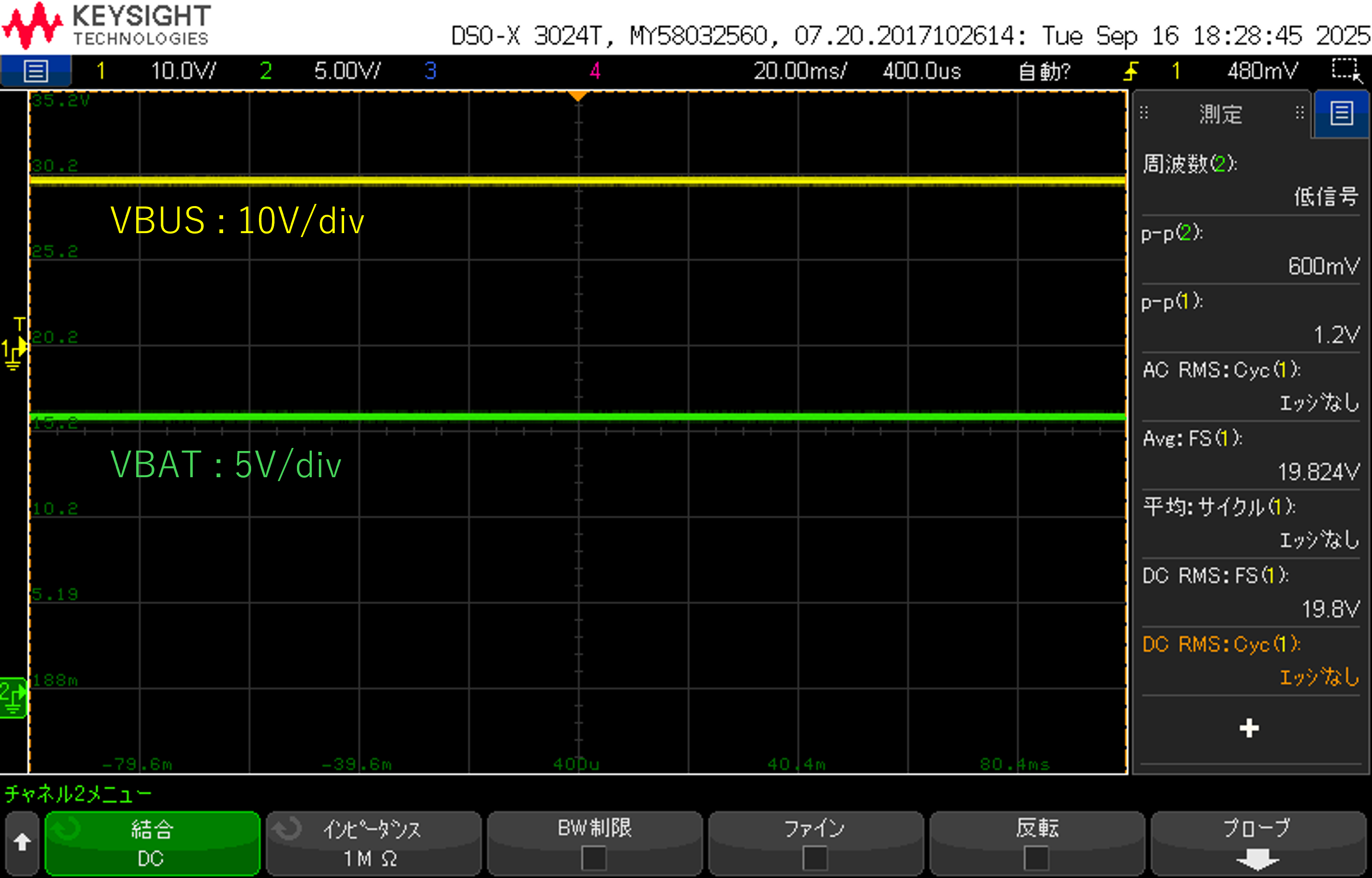 上記画像の通りVBUS : 20V,VBAT : 16Vが出力されておりますので、設定どおりのFirmwareを書き込めていることが確認できました。