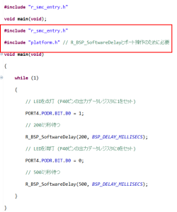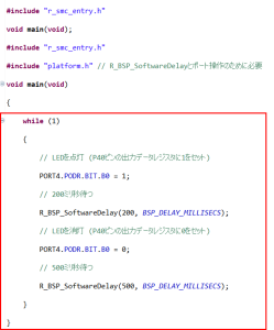 「#include “platform.h”」はこの後、登場する「待つ命令」や「ポートの操作」などMCUに従来備わっている機能を読み込む為のコードです。