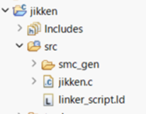 1. 画面左側の「プロジェクト・エクスプローラー」の「src」→「smc_gen」→「jikken.c」にLチカをさせるプログラムを書き込んでいきます。