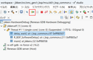 MCUへの書き込みを行い、プログラムのバグを探すための準備をします。赤枠の虫のマークをクリックします。