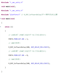 「#include “r_smc_entry.h”」これは、スマートコンフィグレータが自動生成した、マイコンの初期設定(P40は出力など)を読み込む為のコードです。