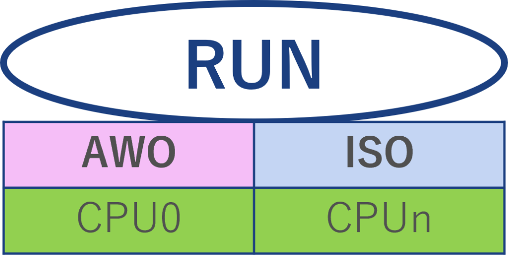 このモードでは、すべての電源が入っている状態であり、全CPUとモジュール(周辺機能)が動作可能な通常動作モードです。