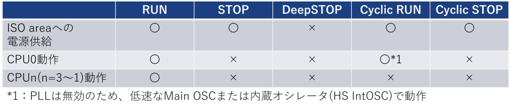 このモードでは、CPU0、AWOエリアの周辺機能、ISOエリアのRLIN3、MSPIが動作可能です。