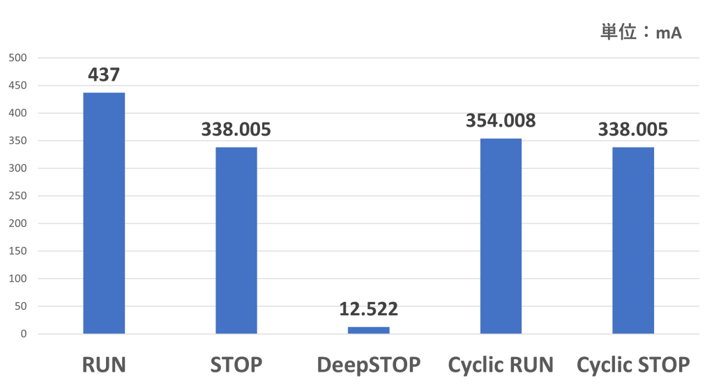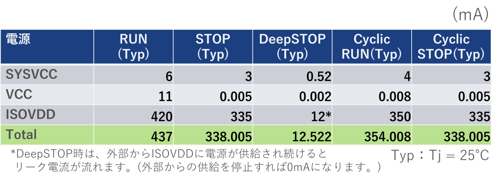 特にDeepSTOPモードではISOエリアの電源が落とされ、CPUも動作していないため、他のモードに比べて大幅に消費電流が落ちることが分かります。