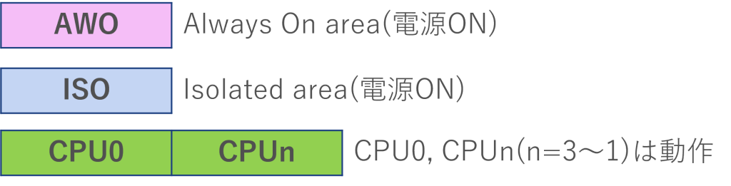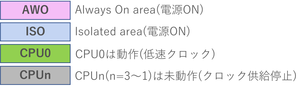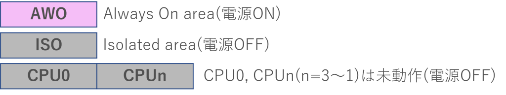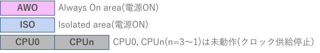 下図のAWO(Always On area)やISO(Isolated area)はマイコンに供給される電源領域を指していて、AWOは常にマイコンに供給されるエリア、ISOはモードによって電源を遮断できるエリアになります。