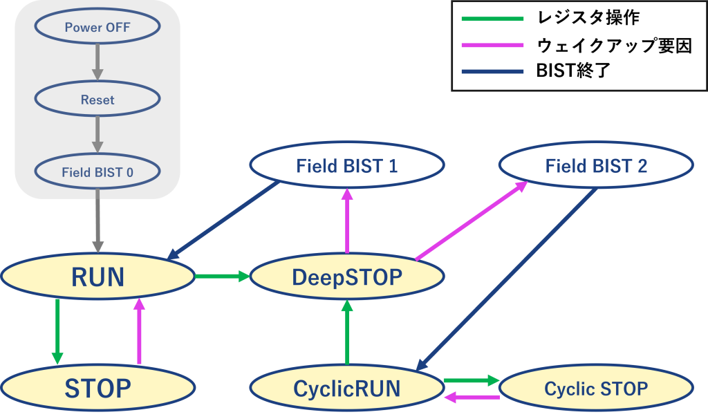 また下図では、上記で紹介したモード以外に「Field BIST」というものがあるかと思います。DeepSTOPから復帰する際にはすぐにRUNモードやCyclic RUNモードに移行するわけではなく、DeepSTOPリセットが発生してBIST(Built-In Self-Test)の実行を挟みます。