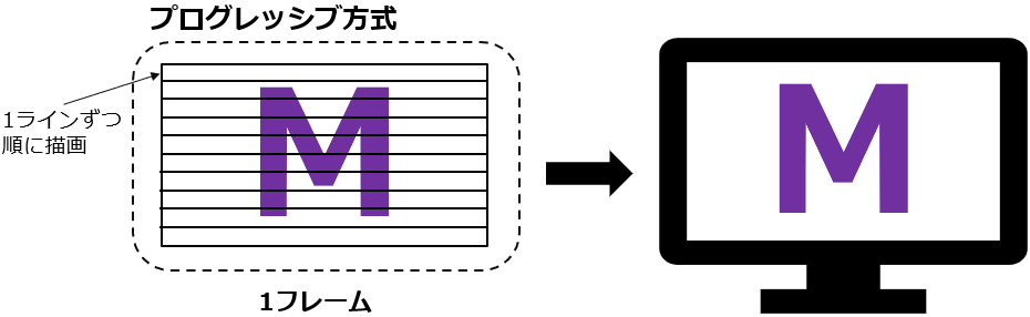 プログレッシブ方式は、1フレームの全ラインを順に描画する方式です。インターレースのようにフィールドを分割せず、完全な画像を1回で更新するため、映像の鮮明さと安定性が大きく向上します。