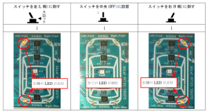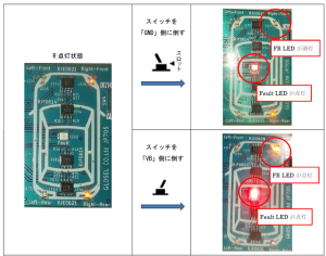 Fault 注入スイッチをGND 側に倒すとGND ショート状態となり、Right-Front LED の点灯タイミングでFault LEDが点灯し、Right-Front LED が消灯します。