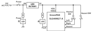 GreenPAK SLG46827-Aを使ったFlasherデモを作成しました。SLG46827-Aは車載でも使用できる製品になりますのでデモ機も活用頂ければと思います。在庫も何台かありますので貸し出し等の対応を可能です。よろしくお願いします。