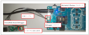 Debugger コネクタにGreenPAK Serial Debugger とケーブル経由で接続することで、開発環境Go ConfigureSoftware Hub を使用したデバッグやデータ書き換えが可能です