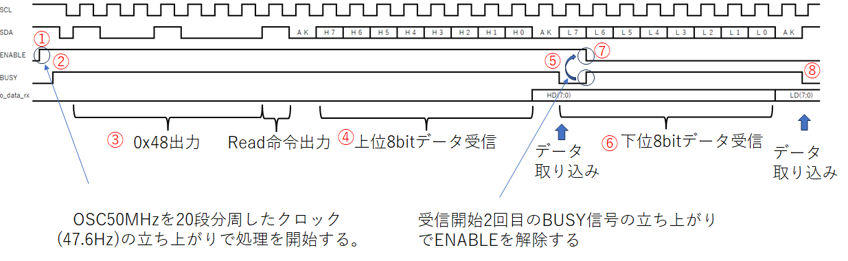⑧受信中にENABLEがLowになると受信終了後にBUSY信号がLowになり、I2C通信が終了します。
