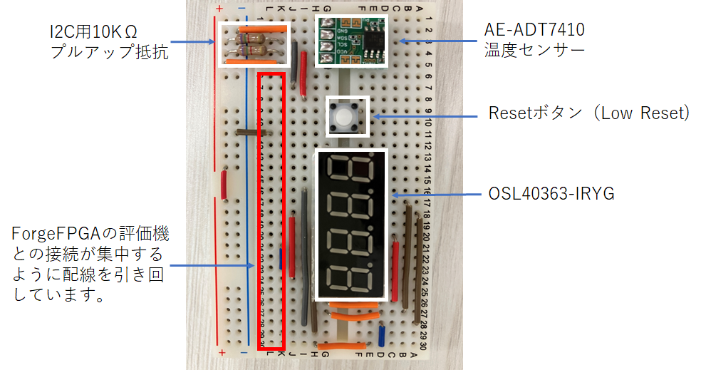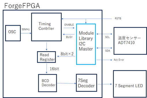 今回はI2Cインタフェースを持つ温度センターとForgeFPGAの評価ボードを接続し、センサーから取り込んだデータを7SegmentLEDに表示させることがModule Libraryで簡単にできるか検証します。