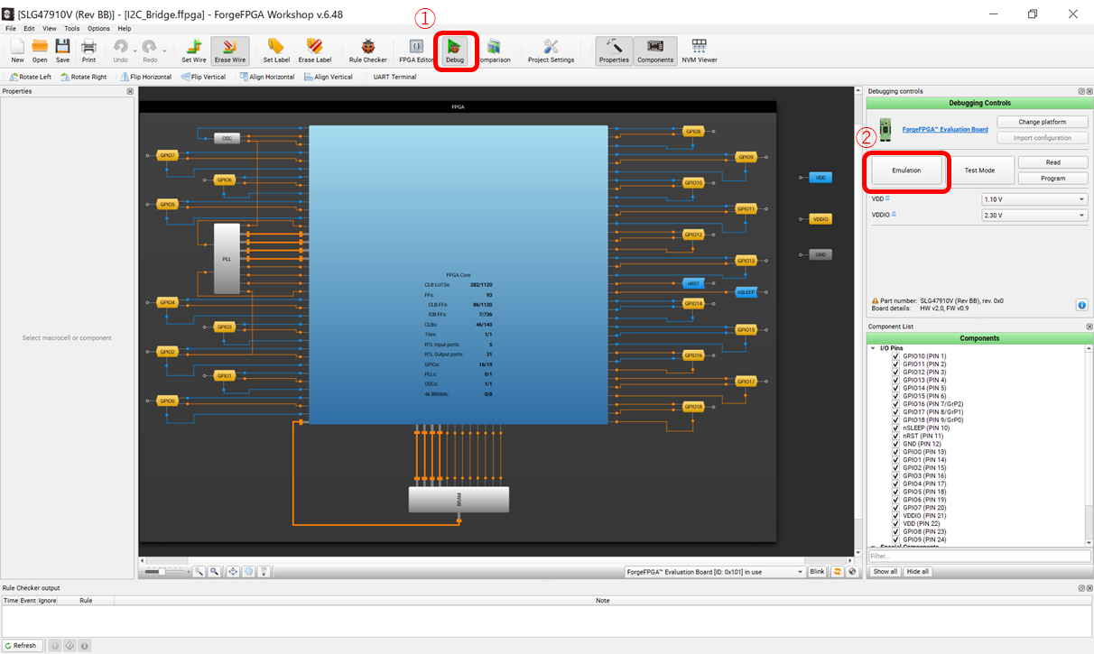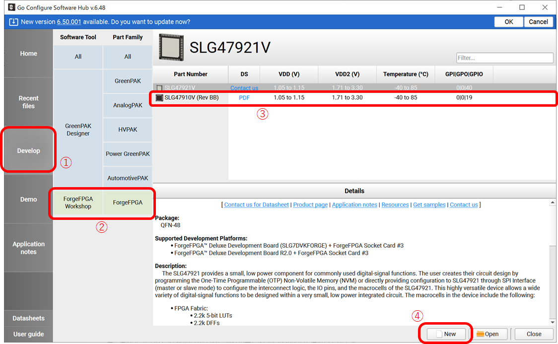 ここで①、②、③の順にクリックしてください。ForgeFPGAのSLG47910V(RevBB)を選択します。