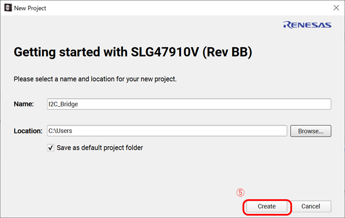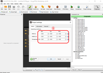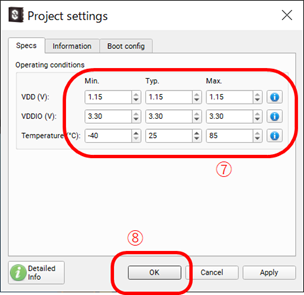 NAMEはプロジェクト名(任意)、Locationは作業ディレクトリ(任意)を指定し、⑤をクリックします。Project SettingというVDDを設定する画面が登場しますが、⑥N/Dの右横の矢印の上を押すと最大値に変化しますので、順番にN/Dをすべて最大値に設定ください。完了すると赤枠の⑦のようになります。ここで⑧のOKをクリックします。