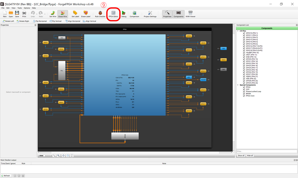 すると下記のような開発画面GUIが現れますので赤枠の⑨”FPGA Editor”をクリックしてください。