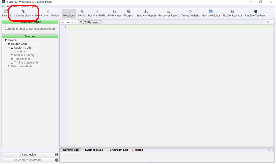 FPGA Editorの画面が開いたら、Module Libraryを呼び出します。