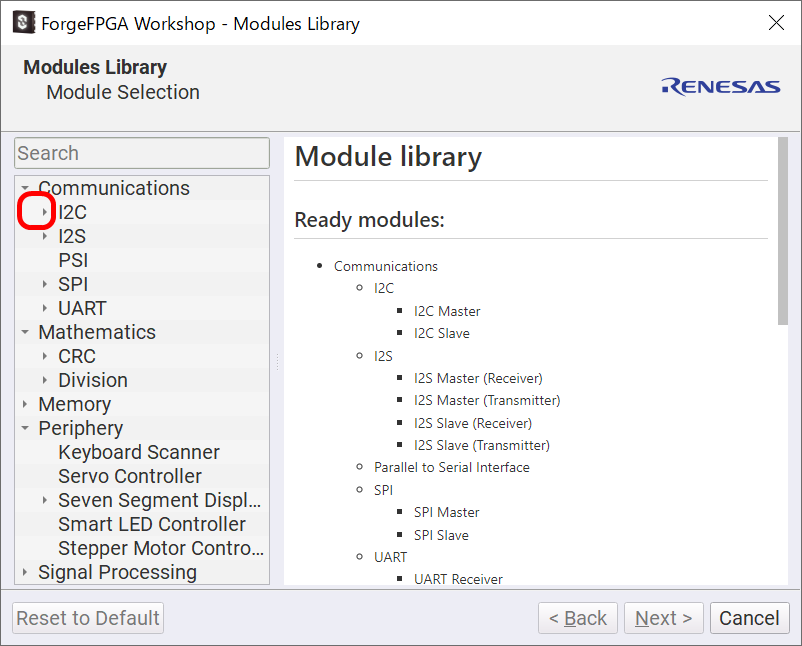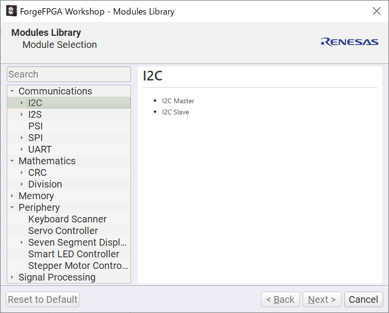 ForgeFPGAでは、各種センサーとのインタフェースで使用されるI2CやSPI等のシリアルインタフェースをライブラリ(Module Library)として準備しています。そのライブラリを使用することで簡単にセンサーとのインタフェースを実現できます。