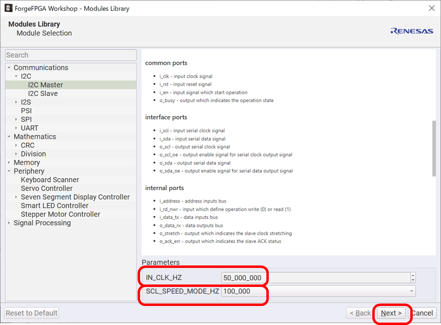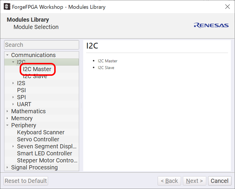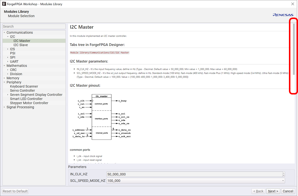 I2C Masterをクリックすると、右側にI2C Masterの仕様が表示されます。