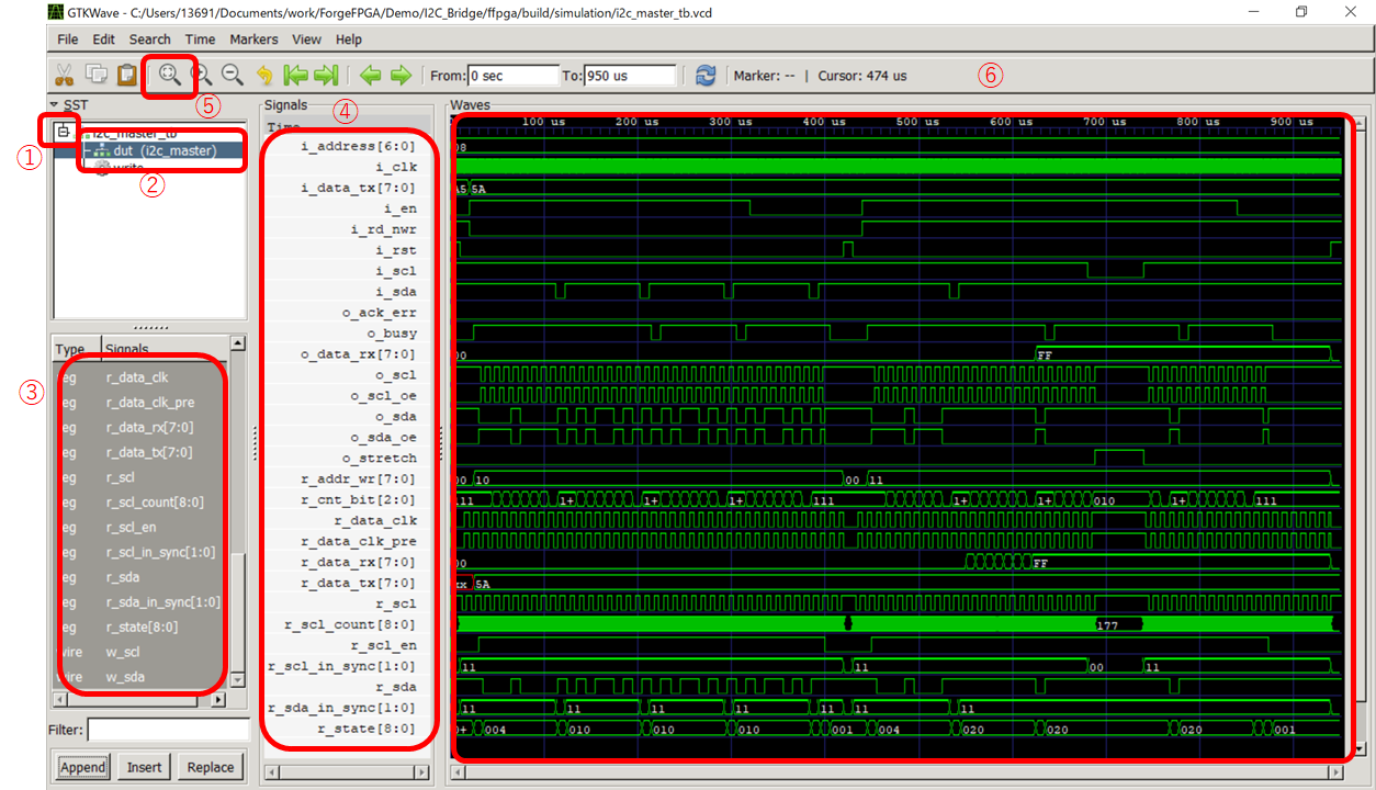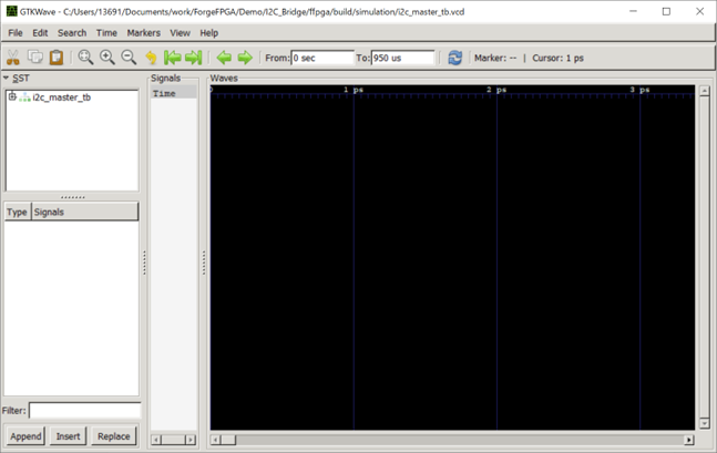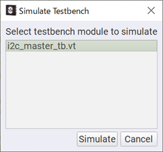 FPGA EDITORの画面でI2C Masterというモジュールが取得できたことが確認できます。テストベンチも取得できているので、このままシミュレーションを実行してみます。