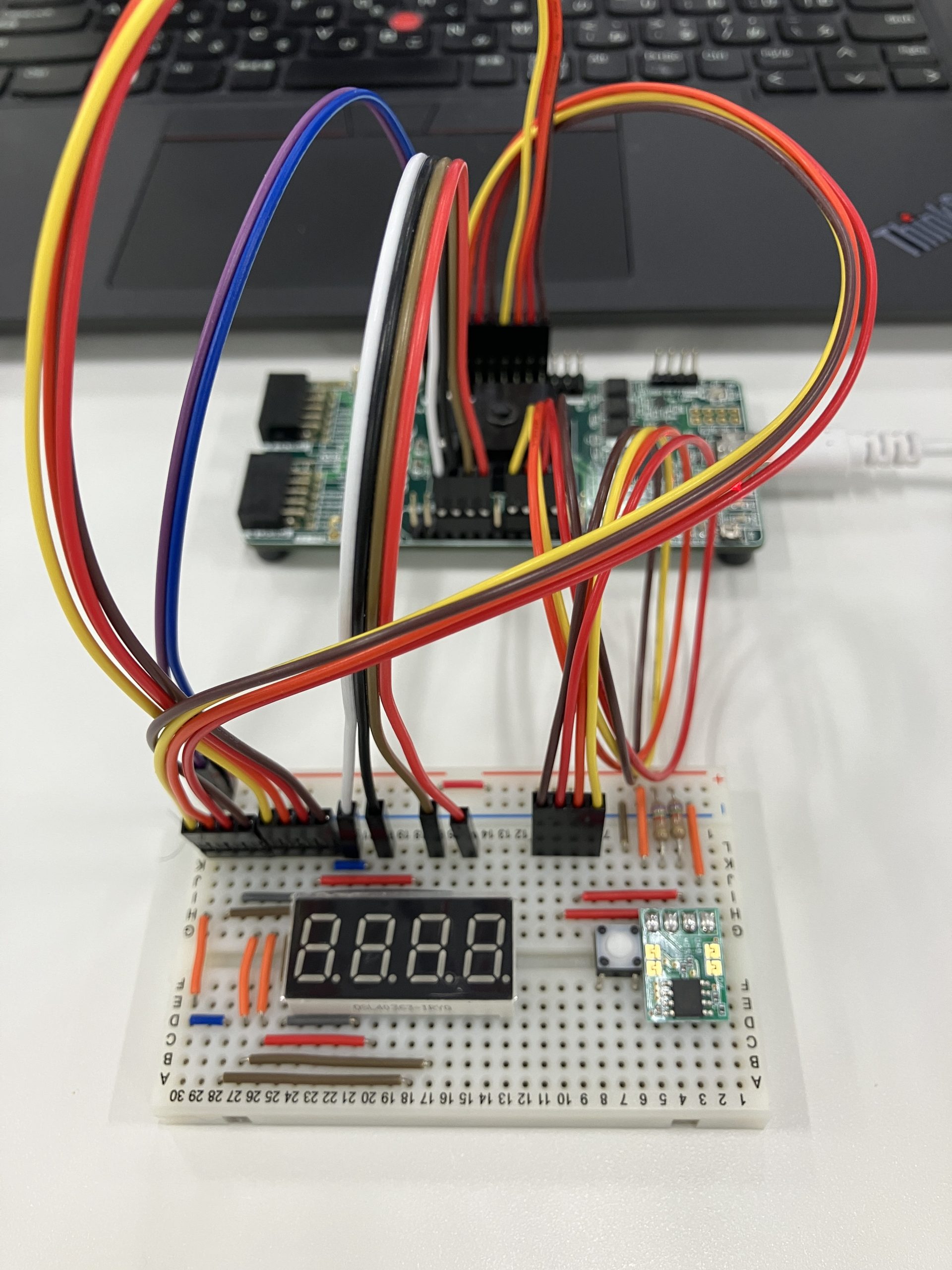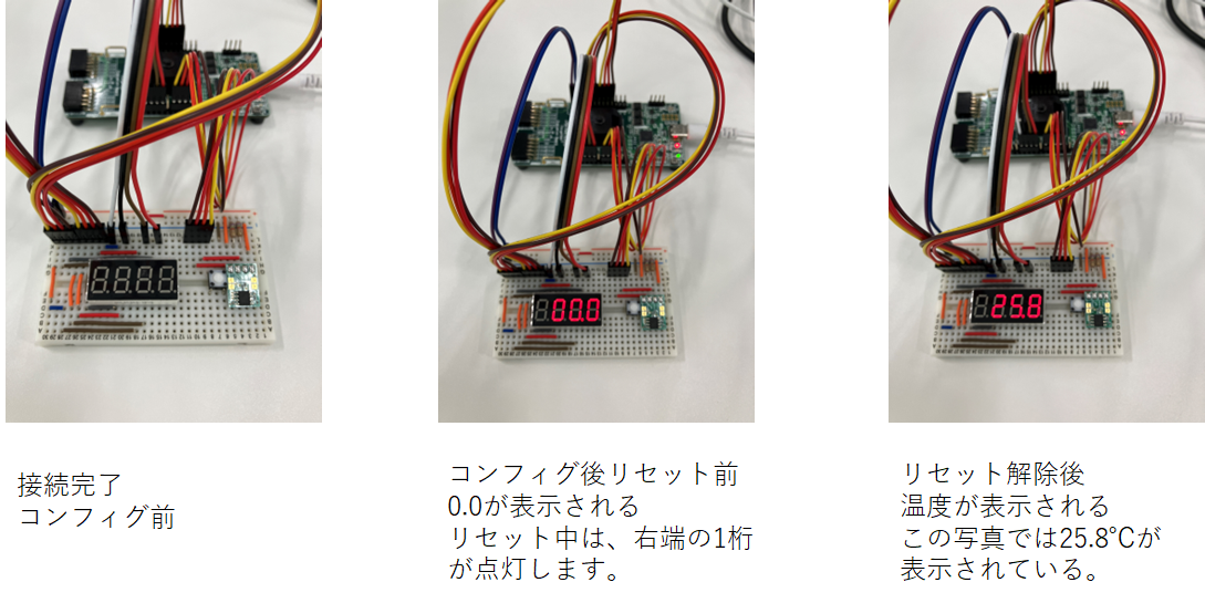 データ転送が終了すると、7Segment LEDが0℃を表示します。その後リセットボタンを押すと温度センサーからデータを受信し現在の室温が表示されます。