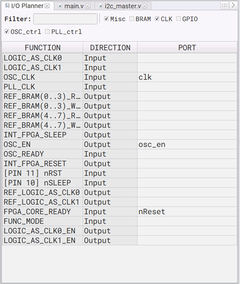 Synthesis tool successfullyとなったら、次に下記の通り、program画面中央上部のIOプランナータブを選択し、各ポートの入出力を設定します。下記の通り、設定してください。