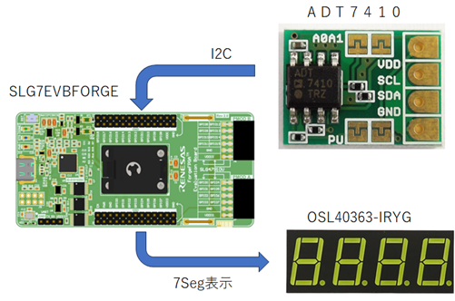 ForgeFPGAのModule Libraryの一つI2Cライブラリを活用するために、対象となるセンサーとしてアナログ・デバイセズ社の温度センサーADT7410を選択しました。また、温度を表示するために7Segment LEDは、4桁表示のOSL40363-IRYGを使用します。ForgeFPGAの評価ボードを使用して下記構成で、温度センサーから温度情報を受け取り、7 Segment LEDに表示を行います。