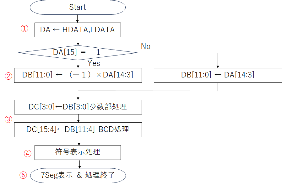 I2Cから取り込んだHDATA[7:0]とLDATA[7:0]は16bitデータとして扱います。ADT7410から出力される16bitデータは、13bitを有効桁として2の補数で出力されるので、BCD変換してから7Segment LEDに出力することで温度が表示されます。処理手順としては、