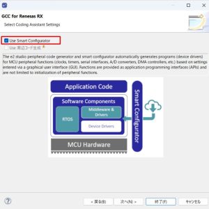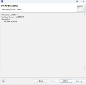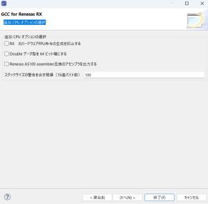 プログラムを書く言語: (CかC++)、コンパイラ (GCC for Renesas RX) 、
