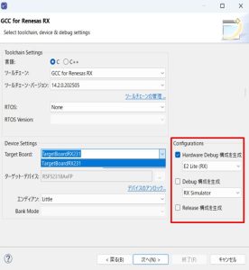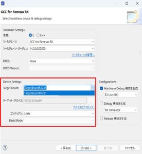 今回は「Target Board for RX231」を使用するので、以下のように設定します。