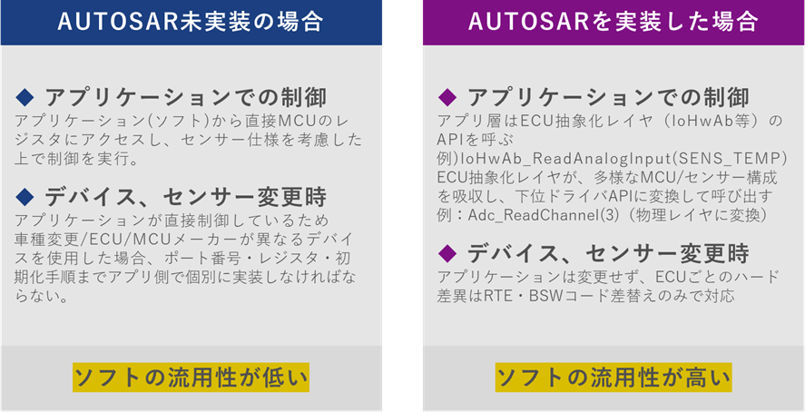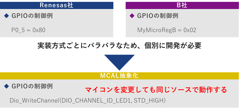 例えばRenesasのRH850と他社MCUを比較した場合、MCUごとの固有なハードウェア操作…