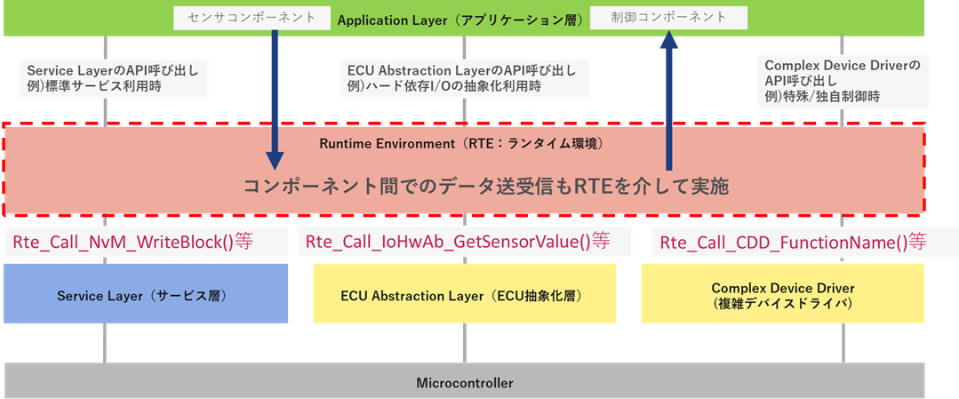 アプリケーション層の各SWCは、RTE(Runtime Environment)を介して、他のSWCやBSW(Basic Software)ドライバ層と通信します。