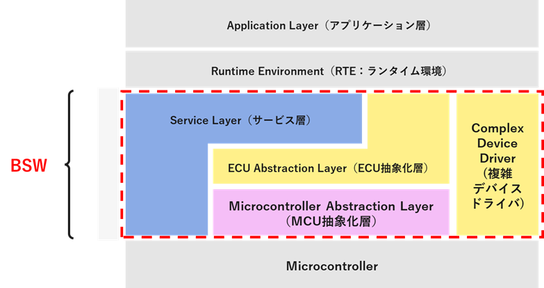 BSWは主にMCAL、ECU Abstractionレイヤー、サービスレイヤー、コンプレックスデバイスドライバの