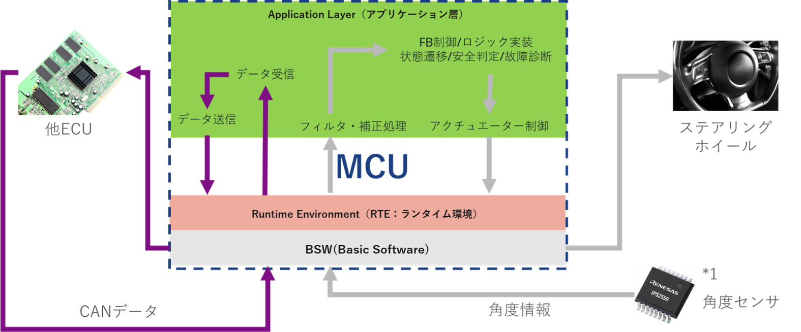 まず。ステアリングを代表としたモーター制御では、車外にある角度センサーからモーターの角度情報の値を取得します
