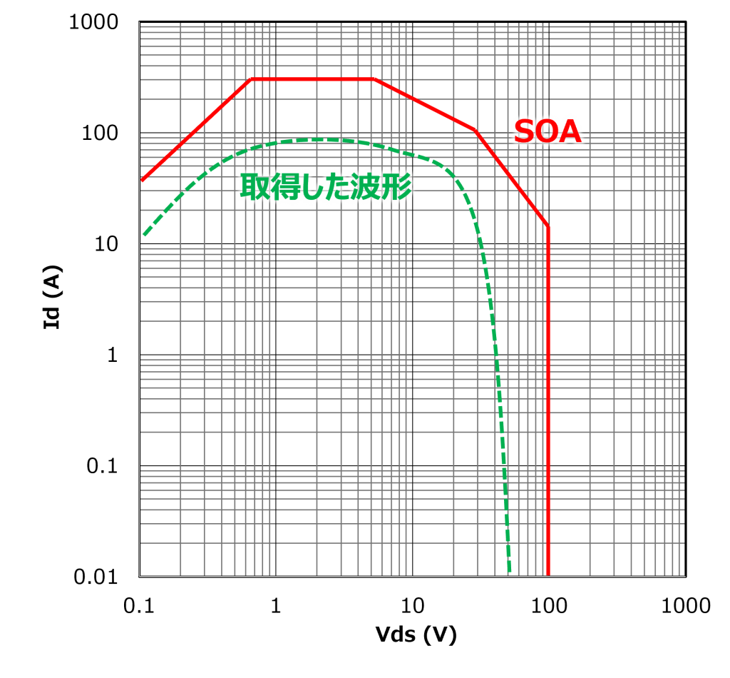 実際の印可波形がSOA領域内であるかの確認には、オシロスコープの機能でSOA同様にId vs Vdsのプロットを行い使用したMOSFETのSOAを重ね合わせてみる、もしくは測定データをCSV等で出力しId vs Vdsのグラフを作図・プロットしSOAと重ね合わせるなどの手段があります。