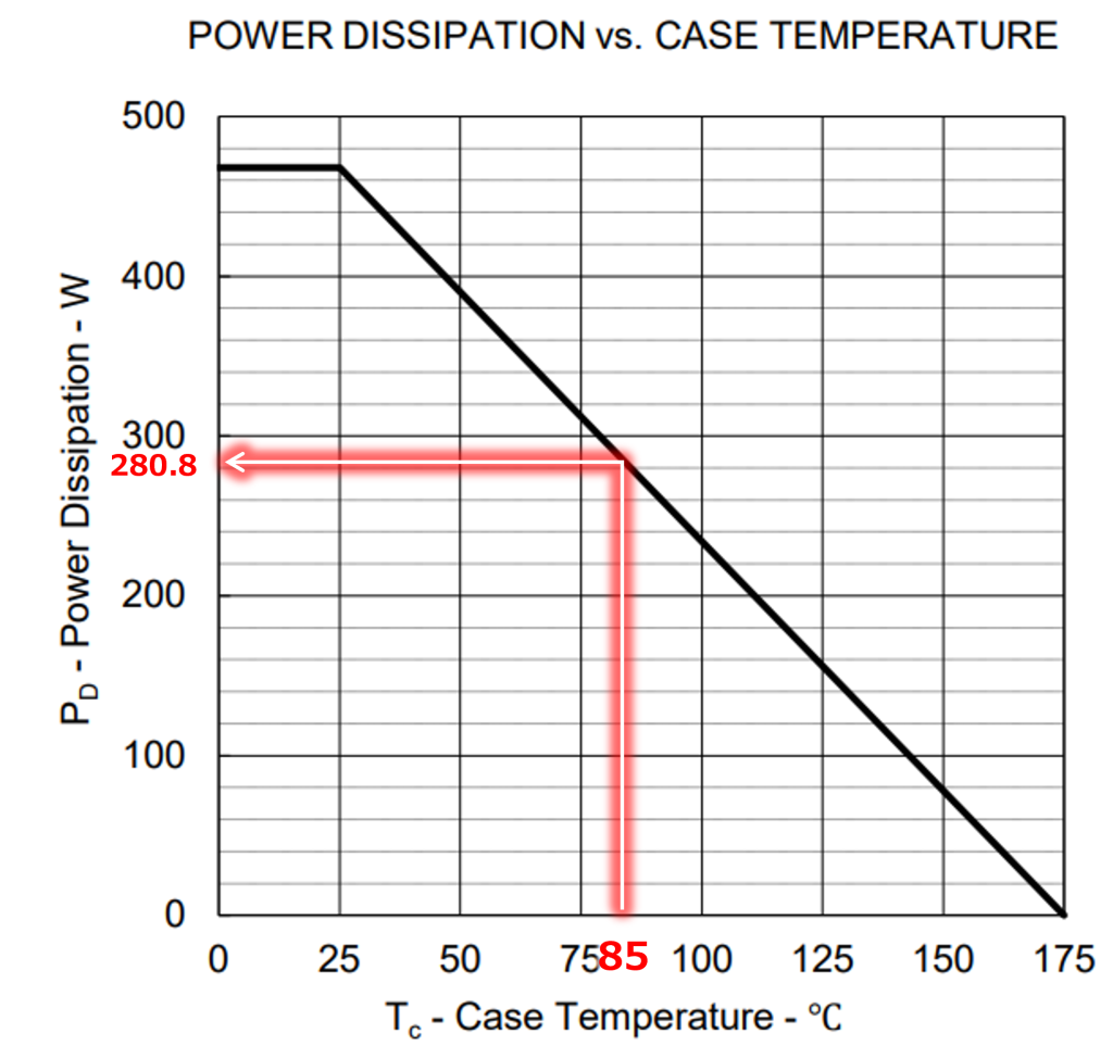 今回であれば25℃ to 175℃で468W* to 0W → 3.12W/℃の傾きのためTc : 85℃で280.8Wと算出できます。