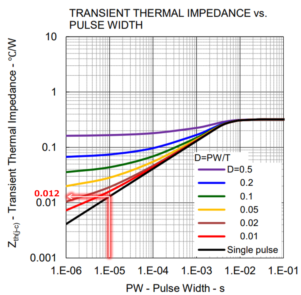 単発パルスのため黒線(Single Pulse)、パルス幅10us(1e-5 s)の値を読みます。対数軸になっていることに注意して0.012 ℃/Wと決定しました。