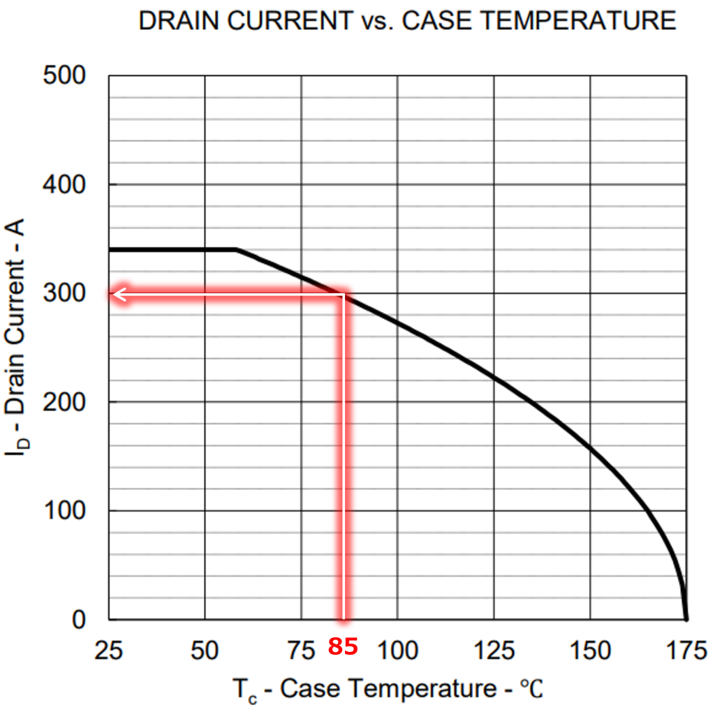 本製品であればId vs Tc特性の記載がありますので、Tc : 85℃のドレイン電流を読みディレーティングを考慮します。Tc : 85℃で300Aとなるので、定格360Aに対して5/6になることがわかります。(Fig.7)