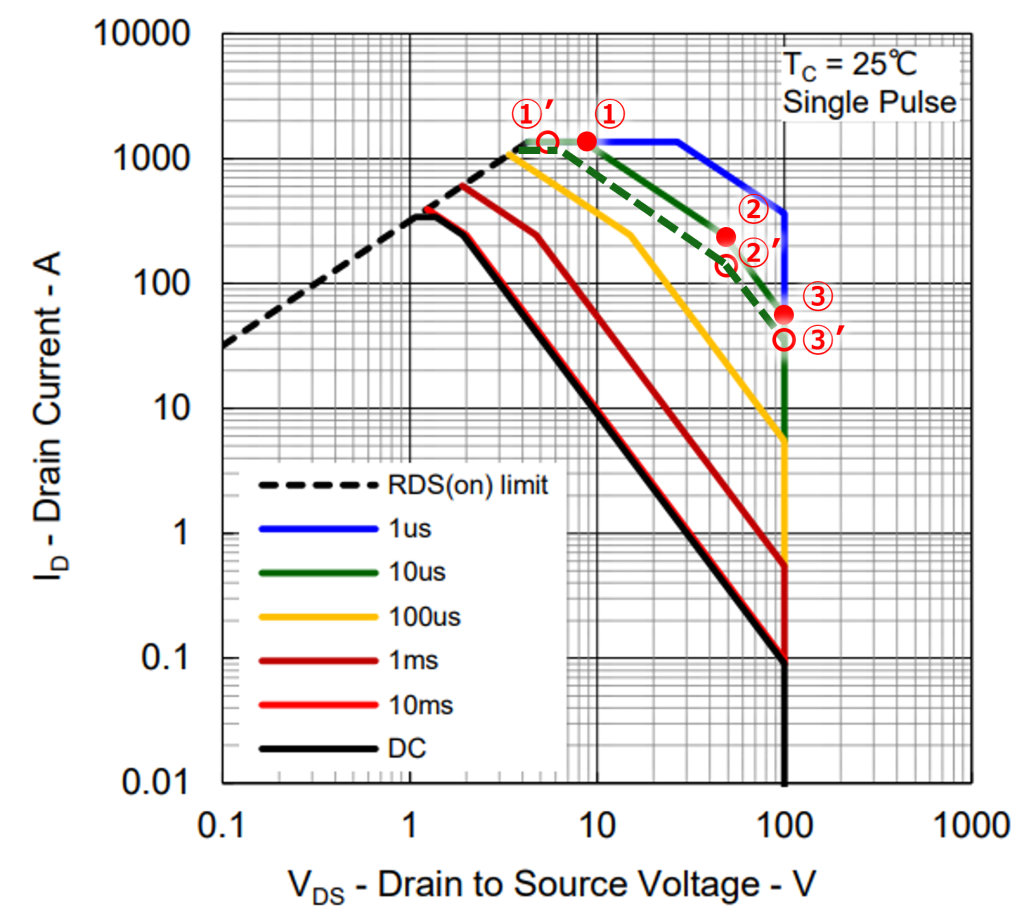 Tc = 25℃ におけるSOAの領域を決定する各点①,② (Fig.6)を7500Wの損失の点に置き換え、元の領域をスライドさせることで許容損失ラインのディレーティング後のSOAの描画が可能です。①Pd = Id * Vdsの式にId = 1360A (絶対最大定格), Pd = 7500W を代入