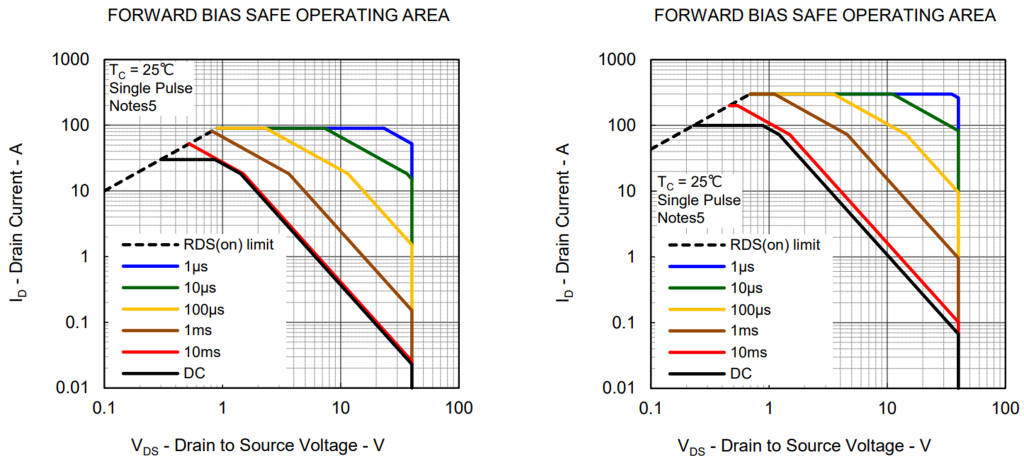 例えば下記ルネサス製MOSFET 2製品のSOAを比べると、定格の大きい製品(RBE023N04R0SZN6)ではDCおよびPulseそれぞれにおいてSOAが広がっている(右上に拡張されている)ため、より電力損失の大きい波形を印可できることがわかります。
