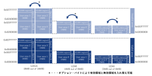 図5では、下側が有効領域、上側が無効領域となっています。有効領域にあるソフトウェアが動作可能となり、無効領域に対してソフトウェアの更新が可能となります。有効領域と無効領域は入れ替えることが可能です。コード・フラッシュ・メモリのソフトウェア全体を更新する場合に適したモードです。